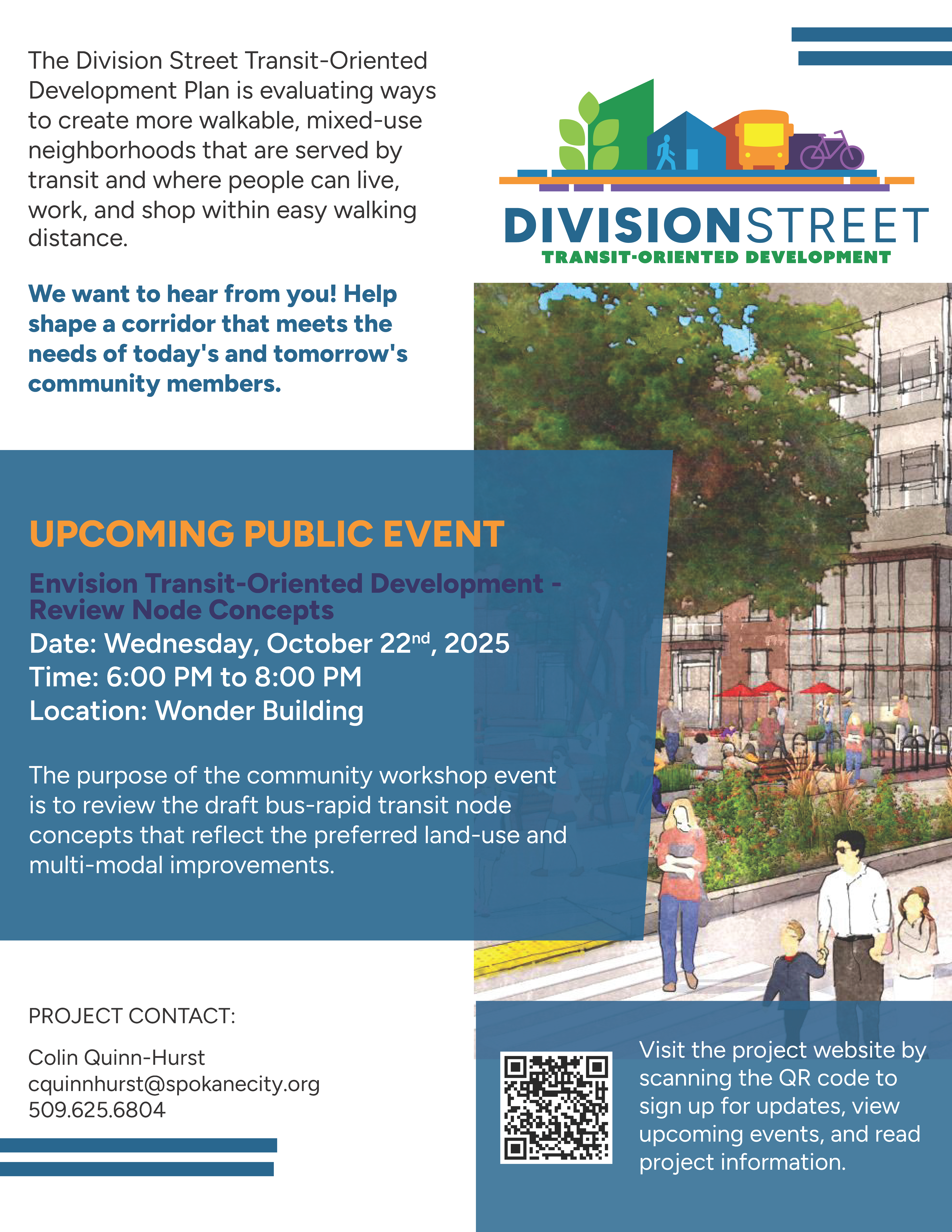 The Division Street TOD Project aims to make the most of our community's upcoming investment in public transit by encouraging accessible, mixed-use communities within close proximity to high-frequency transit stations on the Division Street corridor. This project builds on recent work by the Spokane Regional Transportation Council (SRTC) and STA through the DivisionConnects planning project to set the stage for aligning land use, zoning, and infrastructure with upcoming transit investments. This current TOD study